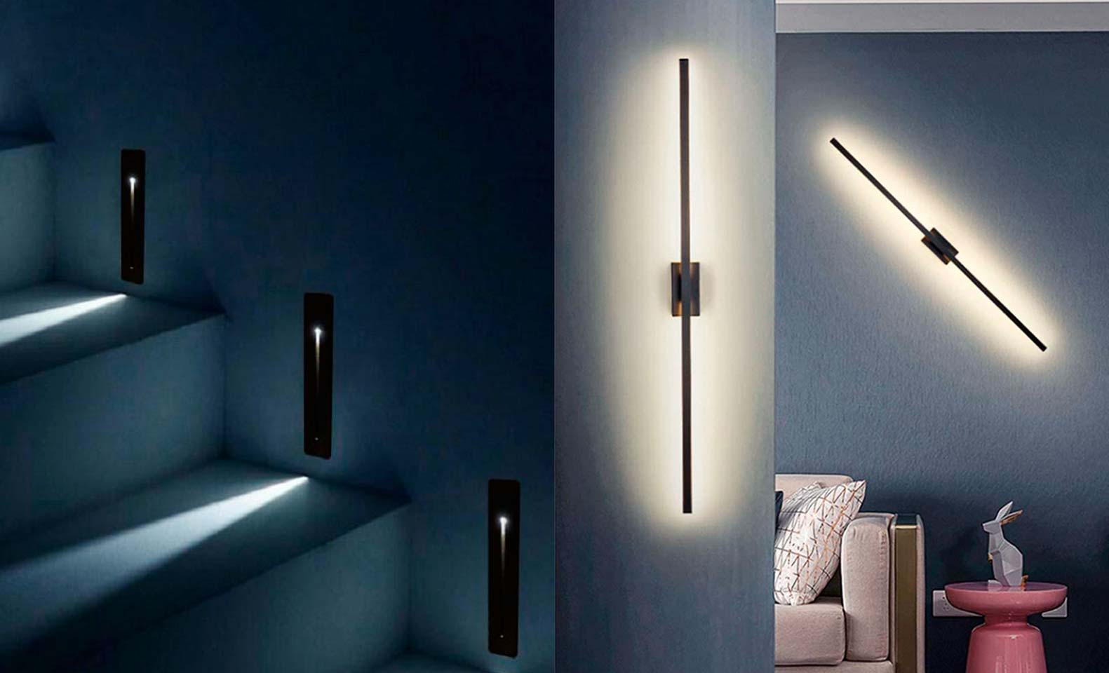 - "Line of light" lamps. This type of lamp consists of a bar of approximately one metre long which marks a straight line on the wall. Vertically, it divides the space into segments, one on one side and one on the other, illuminating both. In the example above they can be seen vertically and diagonally.