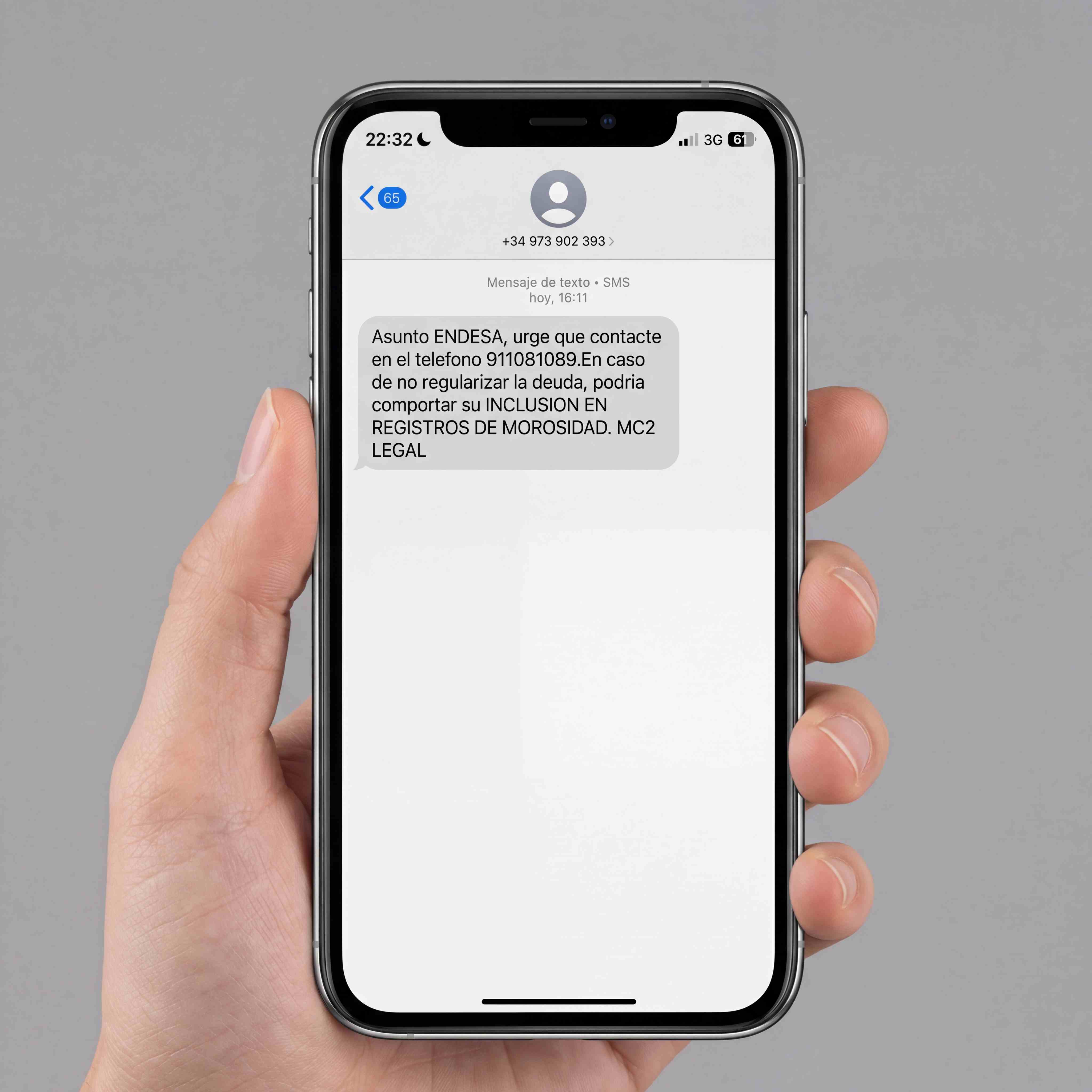 Texto del mensaje:"Asunto ENDESA, urge que contacte en el teléfono 911081089. En caso de no regularizar la deuda, podría comportar su inclusión en registros de morosidad. MC2 LEGAL".