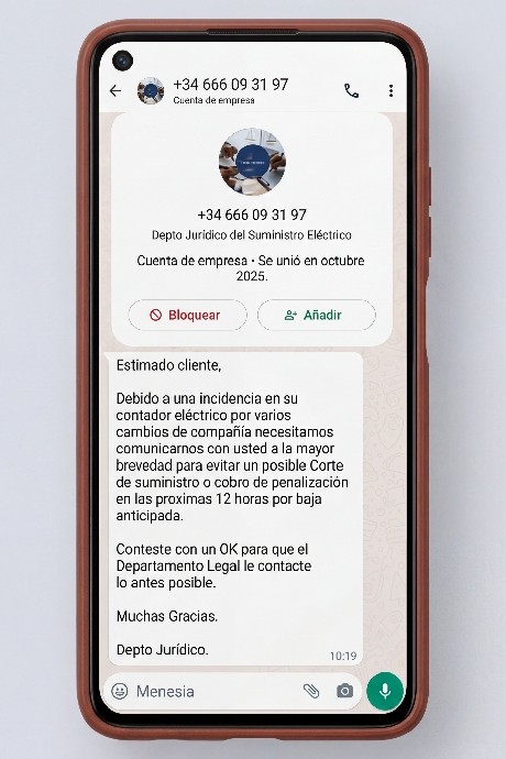 Texto del mensaje: “Estimado cliente, debido a una incidencia en su contador eléctrico por varios cambios de compañía necesitamos comunicarnos con usted a la mayor brevedad para evitar un posible Corte de suministro o cobro de penalización en las próximas 12 horas por baja anticipada. Conteste con un OK para que el Departamento Legal le contacte lo antes posible. Muchas Gracias. Depto Jurídico."